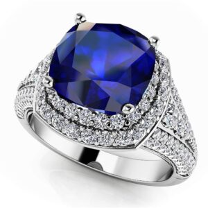 A show-stopping array of diamonds will take her breath away with this stunning ring. The brilliant cushion cut gemstone of your choice is perfectly centered amongst a double halo of icy round diamonds. The diamonds continue in a tapering pattern along the sides of the band to form a lasting legacy of sparkling radiance. Available in several carat weights in your choice of gold or platinum setting. All gemstones are AA quality.