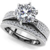 You’ll love the grand sparkle of this diamond bridal set. A beautiful engagement ring features a double row of diamonds are set along the sides and top of the ring shank leading up to a beautiful ring head lined with diamonds, surrounding a brilliant round center diamond. The matching diamond band adds another double row of diamonds to this set! Choose from gold or platinum and five difference sizes ranging from 1.69 to 2.73 total diamond carat weights.