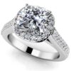 This striking engagement ring features round side diamonds on the shank that taper into the cushion cut center diamond. This simple and elegant design will surely make a lasting impression on your love story. Customize your engagement ring by selecting the metal type, total carat weight, diamond quality and size.