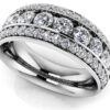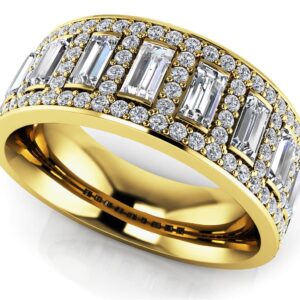 This exquisite ring features unique baguettes surrounded by beautiful round diamonds. This luxurious anniversary ring is the perfect to celebrate your special day. If worn as a fashion statement, this ring is guaranteed to cause diamond envy. Customize yours today with your favorite metal type and diamond quality.