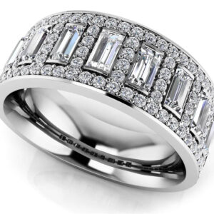 This exquisite ring features unique baguettes surrounded by beautiful round diamonds. This luxurious anniversary ring is the perfect to celebrate your special day. If worn as a fashion statement, this ring is guaranteed to cause diamond envy. Customize yours today with your favorite metal type and diamond quality.