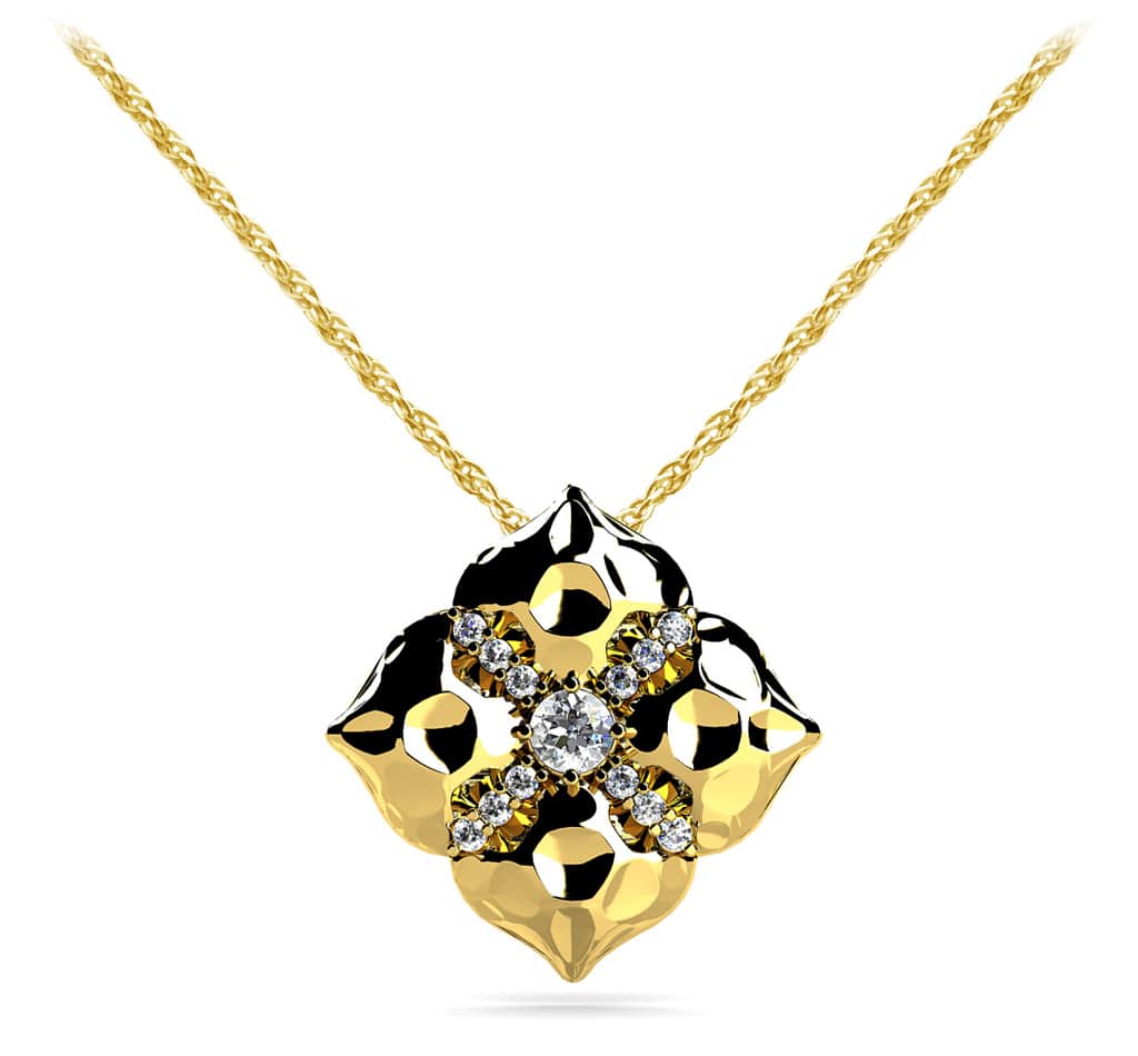 This magnolia shaped pendant can be made in your choice of gold or platinum and features a total of 13 round diamonds in it’s unique design. One diamond in the middle with four ‘arms’ made of three diamonds each. The stones are prong set and sparkle nicely against the metal backdrop. Customize one of these versatile necklaces today!
