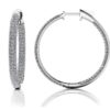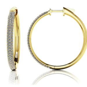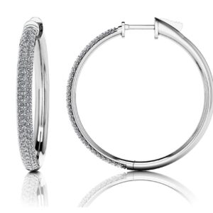Pave set round diamonds twinkle and shine in three rows with these beautiful hoop earrings. Available in your choice of 14k or 18k gold or platinum, these earrings feature our easy to use and secure push button closure ensure these will become your go to earrings.