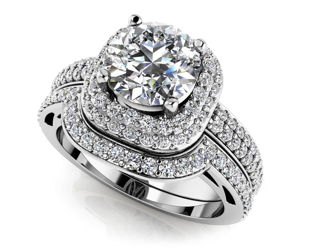 This modern bridal set is a real stunner! It features a beautiful double halo of diamonds around the center stone and 2 rows on the side of the ring. The matching wedding band perfectly accompanies the engagement ring by enhancing it with an additional row of diamonds. Customize the center diamond from a large selection of certified diamonds or with one of our diamonds.