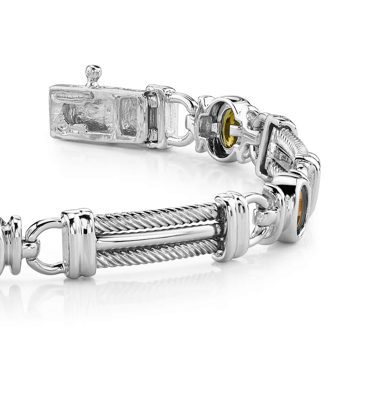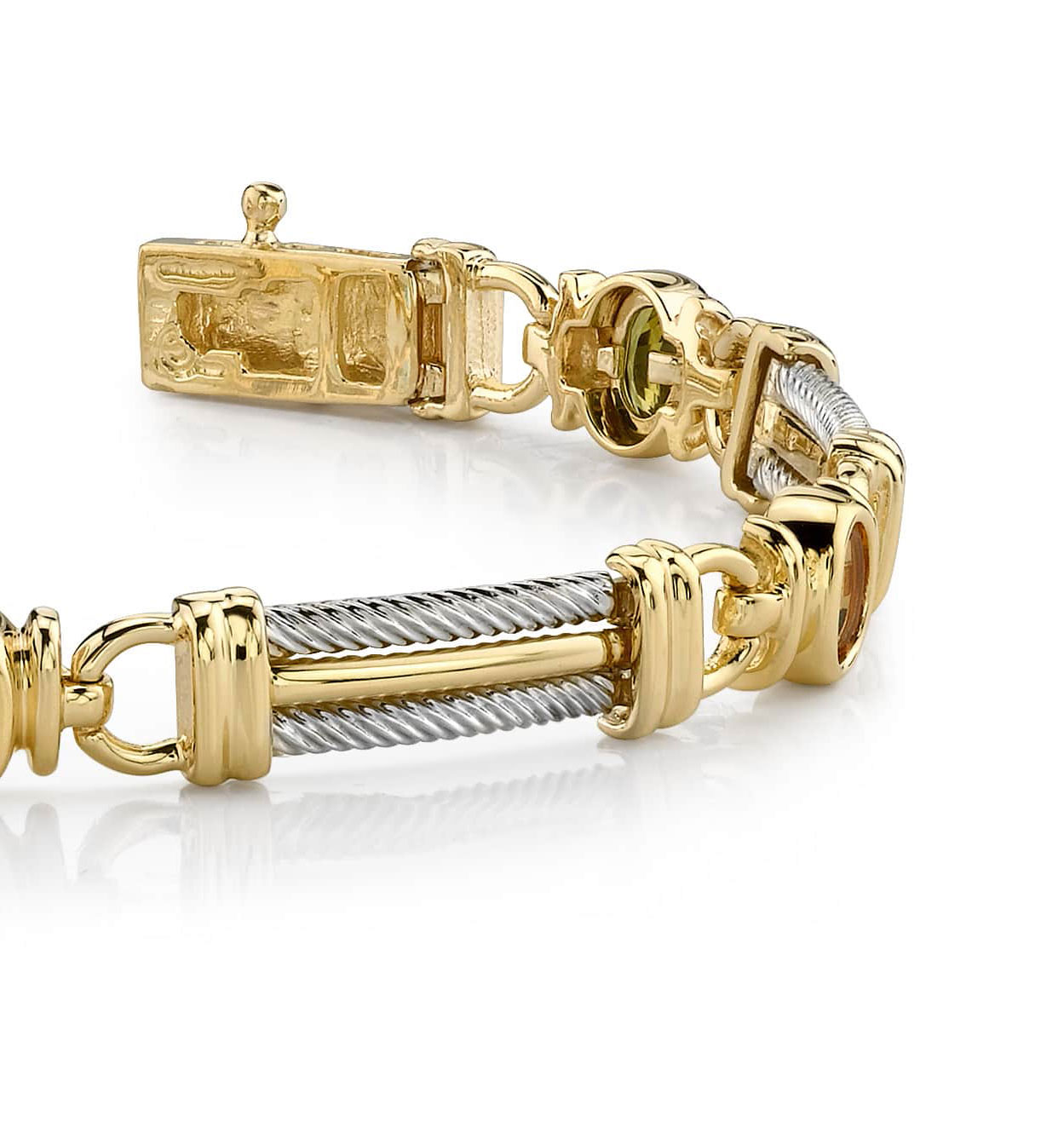 Similar to our Cable Link Gemstone Bracelet, this fabulous piece features links that are slightly more open. The 6 lovely, colored stones are oval in shape, and fabulous in design! Available in gold or platinum, the cabling effect on the bracelet is very unique. This gemstone bracelet features a very sturdy clasp that allows the bracelet to sit securely on the wrist, but moves with you. Add some glamour with this piece in your jewelry wardrobe today!