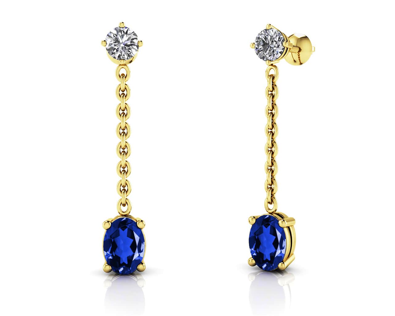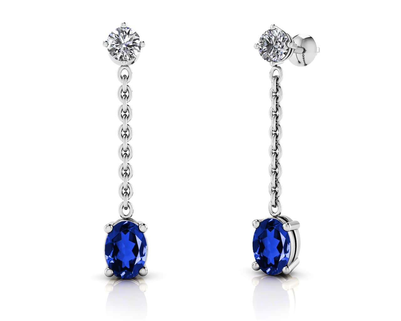 Modern and unique, these beautiful diamond and gemstone drop earrings will catch your eye! A round icy diamond draws the eye to the delicate chain leading to the vibrant oval shaped gemstone of your choice. Available in your choice of gold or platinum setting.