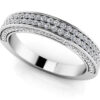 This diamond anniversary ring features three sections of round brilliant prong set diamonds. The center section is a larger round diamond surrounded by millgrain edge details and a row of diamonds around it . all in a circular shape. On either side is a slightly smaller circle with round diamonds set in the same design. The ring shank is also lined with diamond and edging. Choose from three sizes ranging from .50 to 1.48 total diamond weights and your favorite metal type to create an unforgettable ring to match your everlasting love.