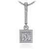 This drop pendant necklace features a diamond lined loop with a square shaped drop portion below. The drop portion contains a stunning princess cut gemstone bordered by smaller round diamonds. A secure prong setting holds each stone in place. Customize in gold or platinum and choice of 4 carat sizes including .29, .60, .80, and 1.05.