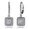 These diamond drop earrings feature a diamond lined lever back with a square shaped drop portion below. The drop portion contains a stunning princess cut diamond bordered by smaller round diamonds. A secure prong setting holds each diamond in place. Customize in gold or platinum and choice of 4 carat sizes including .58, 1.21, 1.62, and 2.11.