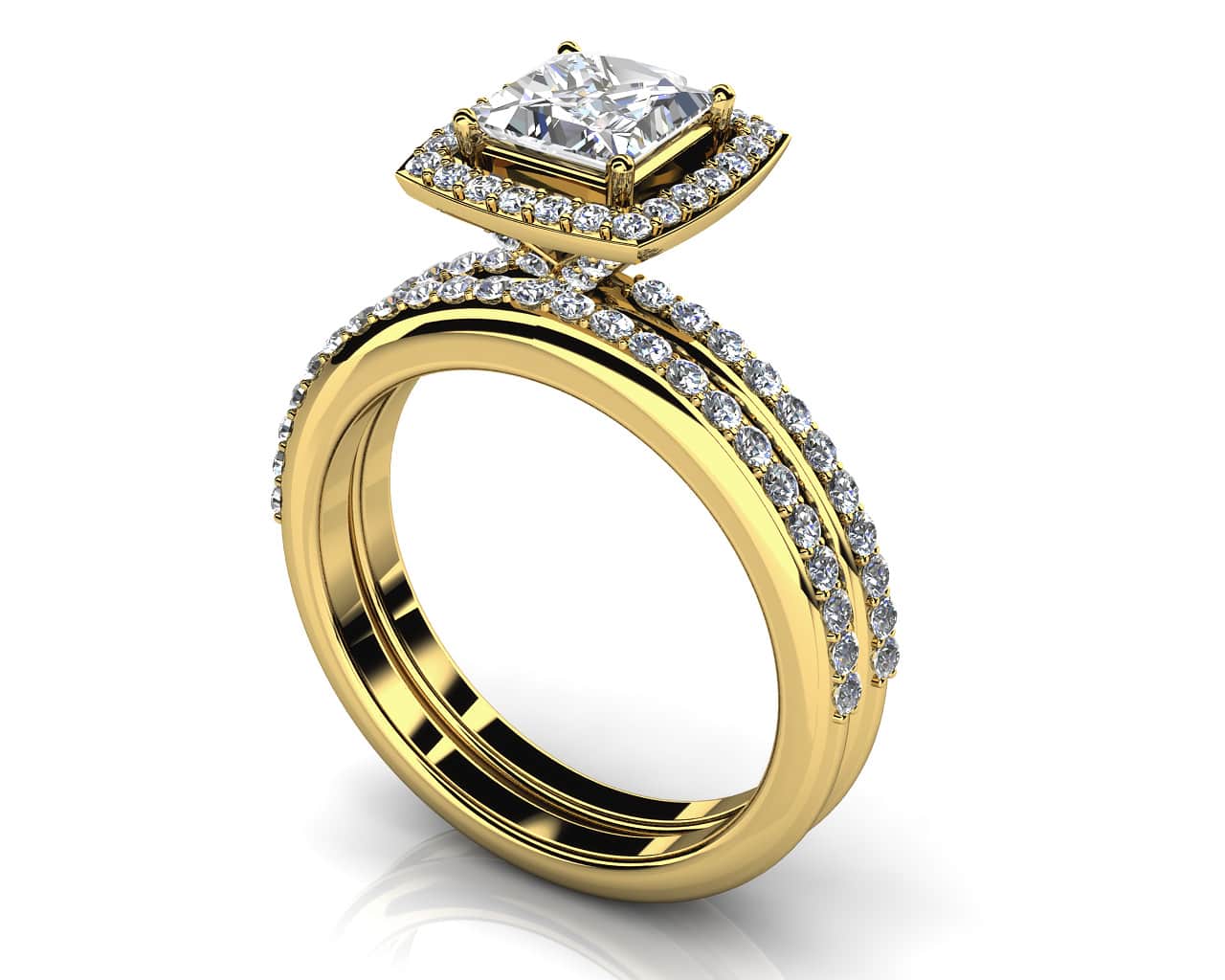 You can see the diamonds sparkling from all directions in this beautiful diamond wedding set. The engagement ring features a princess cut diamond accented by smaller round diamonds around the border and along the band. A matching diamond band sits perfectly flush with the engagement ring. You can choose from five sizes ranging from .95 to 2.04 total diamond carat weights, your favorite metal type and diamond quality to create the perfect pair of bridal rings!