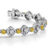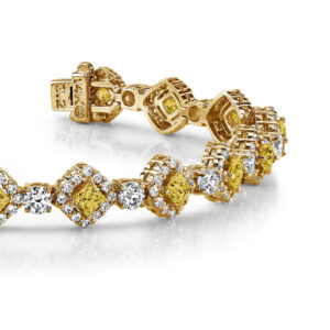 This breathtaking gemstone bracelet features stunning princess cut gemstones inside a diamond lined slanted square. Each of those slanted squares alternates with a single round diamond held together in a four prong setting. You can have this lovely piece made in your choice of white gold, yellow gold or platinum. This bracelet is available in three sizes, and will have between 210 and 252 stones depending on the size you choose. This is a bracelet you will wear when you want to feel like royalty!