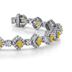 This breathtaking gemstone bracelet features stunning princess cut gemstones inside a diamond lined slanted square. Each of those slanted squares alternates with a single round diamond held together in a four prong setting. You can have this lovely piece made in your choice of white gold, yellow gold or platinum. This bracelet is available in three sizes, and will have between 210 and 252 stones depending on the size you choose. This is a bracelet you will wear when you want to feel like royalty!