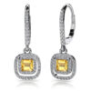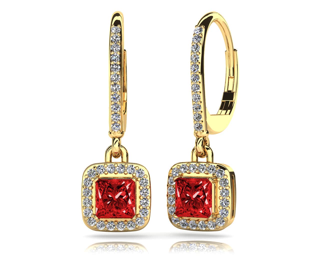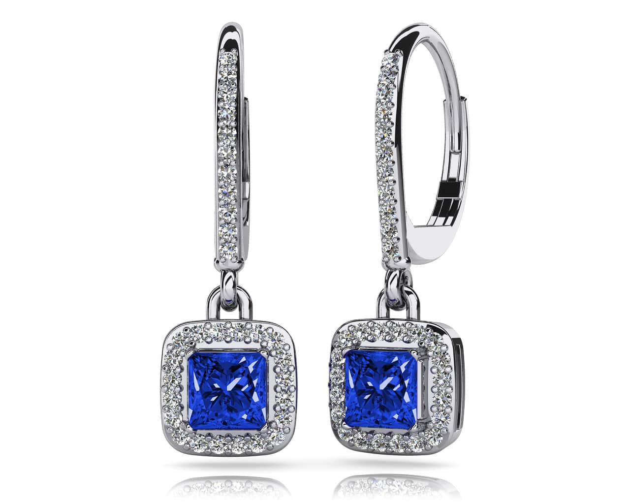 These beautiful gemstone and diamond drop earrings feature diamond lined lever backs with a square shaped drop portion dangling below. Each drop portion contains a lovely princess cut gemstone, accented with smaller round diamonds around the perimeter. These earrings have incredible sparkle and can be customized in your choice of gold or platinum, favorite gemstone and three carat sizes. All gemstones are AA quality.