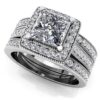 This diamond bridal set features an engagement ring with a dazzling princess cut diamond set with four prongs and surrounded by smaller diamonds. The ring head has a complimentary square shape to it, which further enhances the beauty of the princess cut diamond. Round diamonds are lined on the ring shank and on the matching diamond band. Millgrain edging adds a unique element to the bridal set. There are five sizes available including .97, 1.15, 1.53, 1.77, and 2.02 total diamond carat weights.