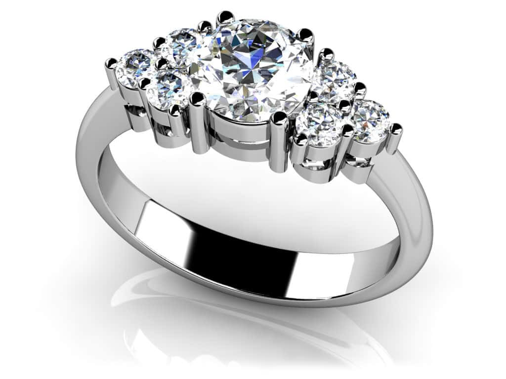 A classic four-prong setting is the perfect location to show off this lovely round, center stone. It’s available in 1 of 1.3 carats total diamond weight. Either one features 8 smaller diamonds, 4 on each side, which are channel-set, and do a masterful job of reflecting light off the center stone. This ring is available in gold or platinum, so why not dazzle her with this one today!