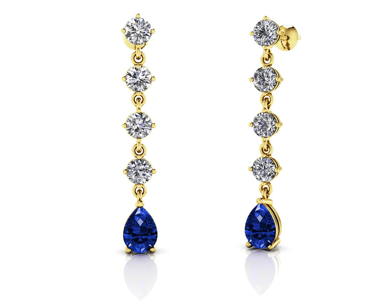 Unique and elegant these earrings will sparkle with the vivid color of natural gemstones! Four round diamonds drop to an elegant pear-shaped gemstone of your choice. Add your unique touch by choosing the total carat weight, gemstone and choice of metal.