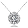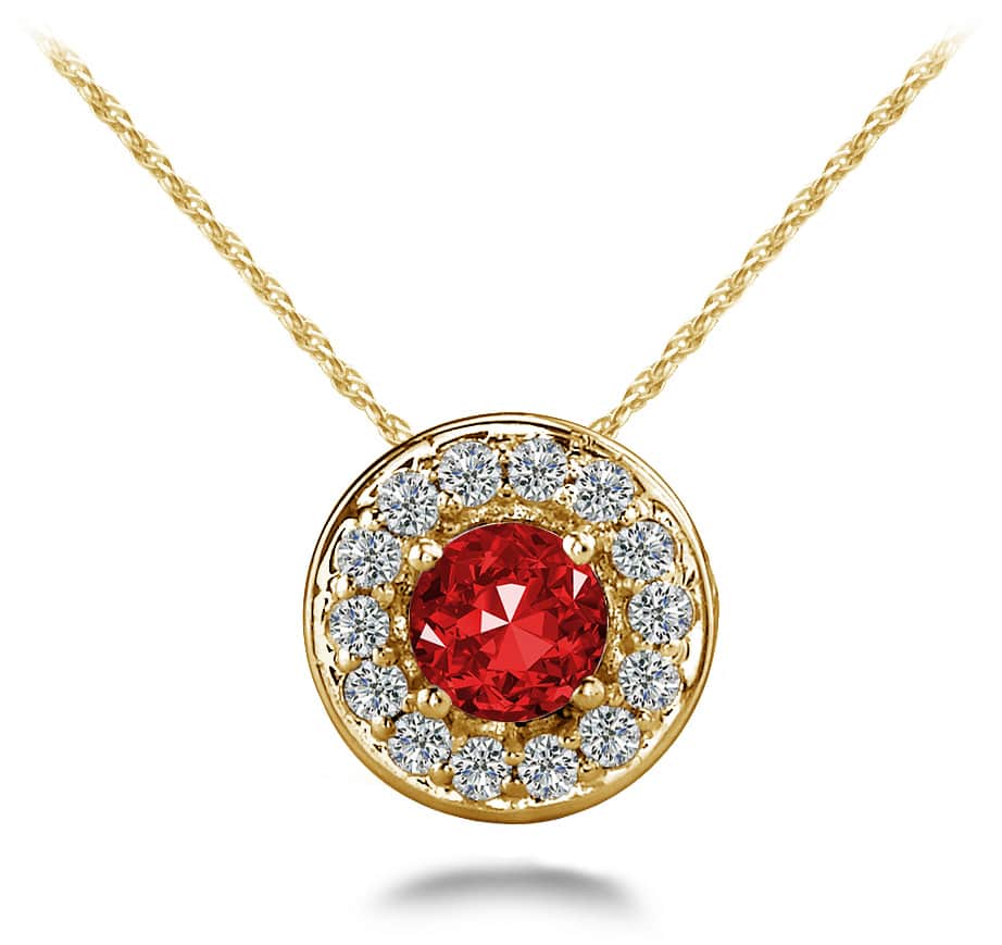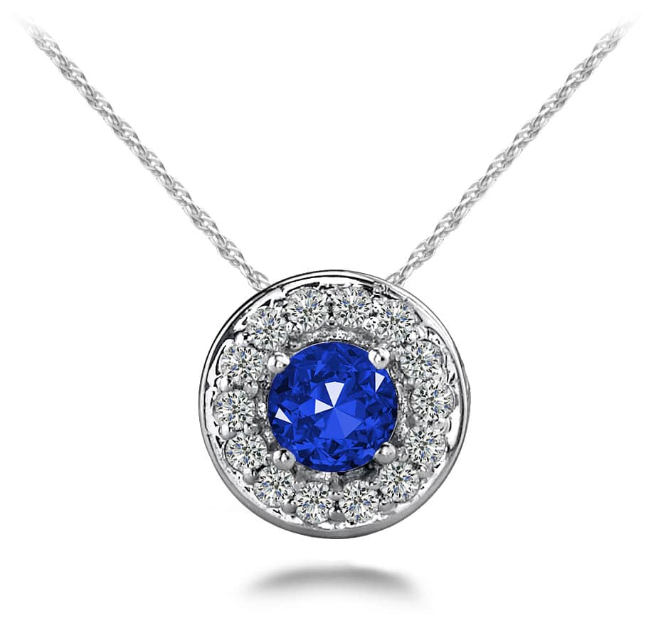 This pendant necklace features a lovely round gemstone that is prong set and surrounded by a circle of smaller prong set diamonds. The overall sparkle is very stunning! You can choose to make the .25 or .50 carat in your favorite metal type and then select the gemstone of your choice. Order the gold or platinum chain in any length to ensure this pendant highlights your neckline.