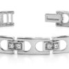 Our designers have been at it again, finding the perfect blend of show and strength! This lovely bracelet features buckle-inspired links, held together by incredible, solid, shiny rectangles. In the centre of each lovely buckle sits a perfect, round, diamond. This powerful piece features 10 diamonds, with a total diamond weight of just under 1 carat. Have our master craftsmen design this in gold or platinum for you today!