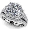 This astonishing bridal set features round side diamonds on the shank that build into the stylish single halo and a cushion cut center diamond. Customize your bridal set by selecting the metal type, total carat weight, diamond quality and size.
