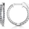 Another dimension of sparkle is created with this inside out hoop earring style. A single row of sparkly prong set diamonds line the front side and inside. These medium sized hoops are the perfect accessory for any occasion. Available in five different sizes ranging from .82 carat to 2.07 carats! A great gift for the women in your life, these earrings can be custom made according to your choice in metal type and diamond quality. This diamond earring style is available in small and large sizes also.