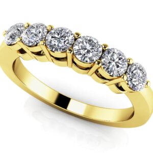 This lovely ring is available in two sizes, either the half a carat total diamond weight or almost a full carat total diamond weight. It will sparkle and shine from all angles, thanks to the lovely row of 6 incredible stones, each one carefully prong-set. What a wonderful band to celebrate your marriage or an anniversary! As a wedding band, it sits perfectly alongside many of our fabulous engagement rings, but it certainly has the personality and character to stand on its own also!
