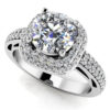 For a ring that speaks louder than words, show your love with this exquisite three stone ring. A brilliant gemstone of your choice is nestled between two smaller sparkling round diamonds, with pave set diamonds that continue along the band. Available in gold or platinum setting, say it all without saying anything and give her this stunning ring.