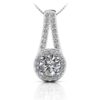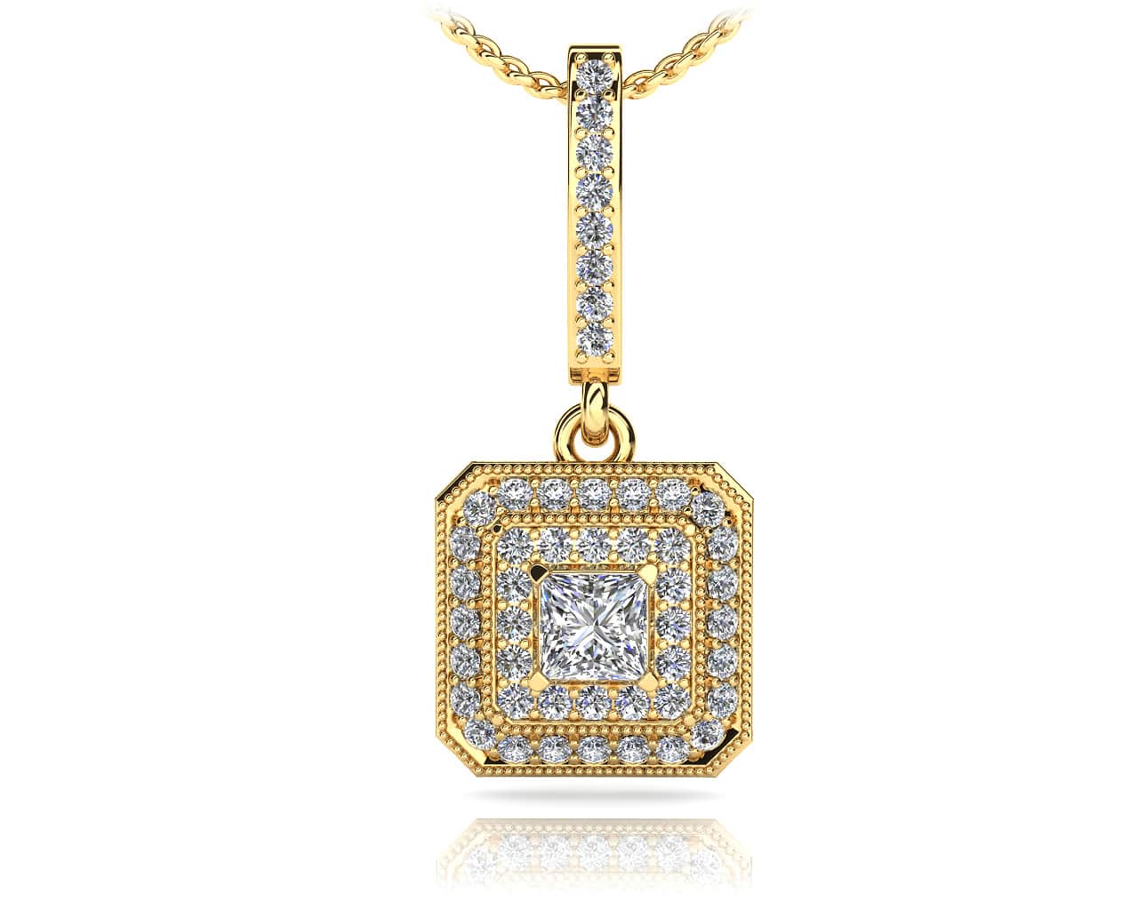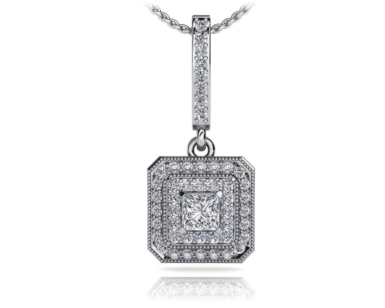 The square shape of this diamond pendant enhances the beauty of the princess cut center diamond. Two rows of rounds diamonds are prong set along the outer edge. Millgrain edge adds a vintage appeal to this modern accessory. Choose from two sizes, .41 or .67 carats for an ideal necklace you’ll wear time and time again!