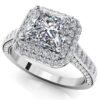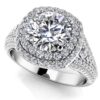 This spectacular engagement ring features a round center, surrounded by a swirl of diamonds in the band. It also has exquisite detailing, which includes millgrain throughout the setting. The round side diamonds add to the brilliance of this stunning ring. Customize her ring by selecting your center diamond, which ranges from .50 ct to 2 ct.