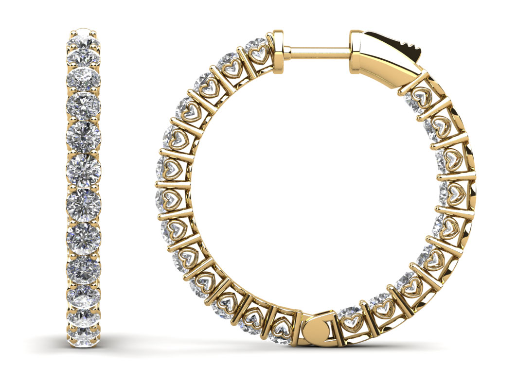 Beautifully crafted hearts adorn each setting in these diamond hoop earrings. Select in your choice of 14k or 18k yellow, rose or white gold or platinum.