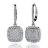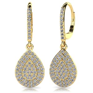 These diamond drop earrings are simply stunning! A diamond lined lever back hoop connects to a cluster of sparkling diamonds below. The teardrop shaped drop contains multiple rows of prong set diamonds. Choose from 1 or 2 carats and gold or platinum for the perfect pair of earrings!