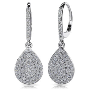 These diamond drop earrings are simply stunning! A diamond lined lever back hoop connects to a cluster of sparkling diamonds below. The teardrop shaped drop contains multiple rows of prong set diamonds. Choose from 1 or 2 carats and gold or platinum for the perfect pair of earrings!