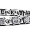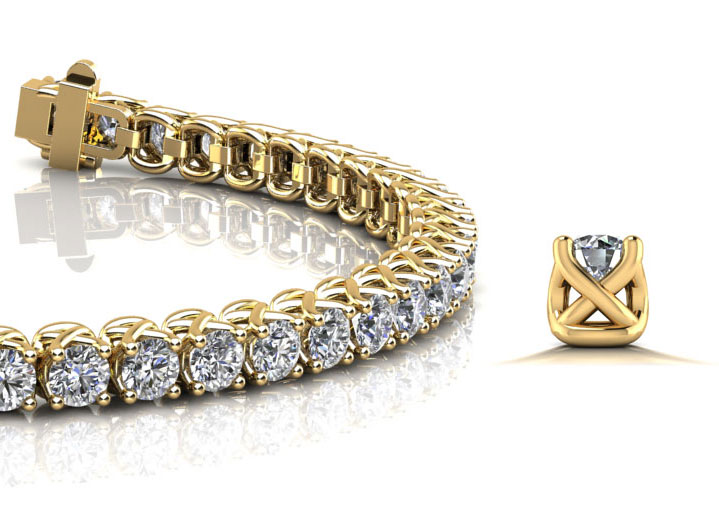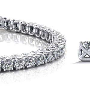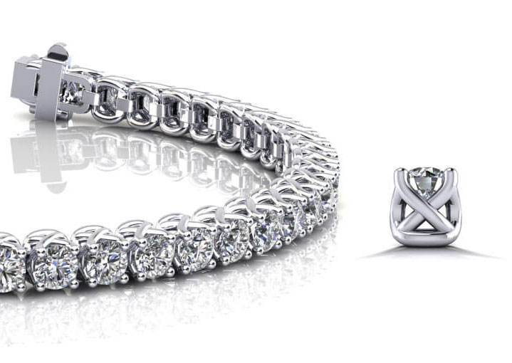 This beautiful, stunning bracelet is a twist on one of our classic four-prong tennis bracelet designs. Each round diamond (available in 2.21 ct. up to 6.72 ct.) is perfectly set within a gently curved cross. The result is a brilliant circle of diamonds married together with elegant settings.