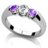 Three beautiful diamonds makes this is a very special ring. With two smaller stones and one slightly larger stone in the middle, this ring is available in three total carat weight sizes for you to choose from; 30 ct., .58 ct. and .73 ct. The band features a squared edge, and sits comfortably on the finger. The diamonds are round, prong-set stones, and will look fabulous for years to come! This lovely piece nestles beautifully up against our Triple Diamond Engagement ring, but would also be a lovely anniversary ring, or even a ring to celebrate the two of you becoming three, with a new baby in your family. Simply perfect!
