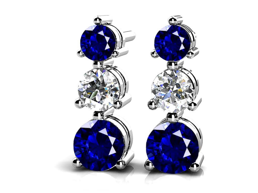 This pair of diamond earrings features one diamond and two sparkly gemstones of your choice. With a secure three prong design, each gemstone is perfectly displayed. The gemstones graduate in size, starting with the smallest size on top and graduating to a larger gemstone on the bottom link. Available in your choice of three sizes including half a carat, three quarters of a carat and one carat, plus you get to play designer as you select what pretty gemstone you want in your earrings. Customize further by selecting your favorite metal type and be amazed as this beautiful accessory brightens up your mood!