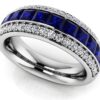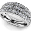 Three rows of remarkable diamonds come together in this exclusive diamond anniversary ring design. The center row has popular princess cut diamonds secured in a channel setting. On either side are rows of round diamonds secured with a shared prong setting. The end result is stunning! Choose from four sizes ranging from 1.07 to 2.42 total diamond carat weights and your favorite metal type.