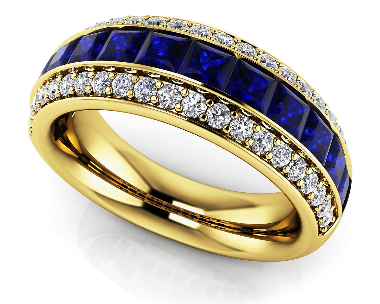 Three rows of remarkable stones come together in this exclusive gemstone and diamond anniversary ring. The center row has vibrant princess cut gemstones secured in a channel setting. On either side are rows of round diamonds secured with a shared prong setting. The end result is spectacular! Choose from four sizes ranging from 1.07 to 2.42 total diamond carat weights and your favorite metal type.