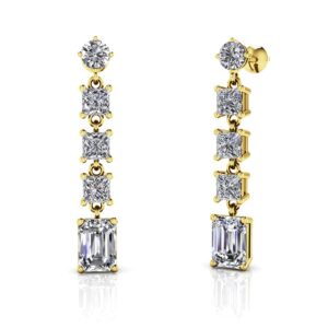 Show off all your unique dazzle with the Three Shape Drop Diamond Earrings. These brilliantly sparkling earrings feature three different stone shapes, round, princess and emerald cut which align in an elegant drop earring. Choose your metal, diamond quality and total carat weight.