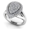 The double halo of stunning round diamonds highlights the center three princess cut natural diamonds. A modern take on a classic setting with additional diamonds set on the side, the detail in this ring will thrill her as an anniversary present. This ring is available in gold or platinum with various diamond qualities.