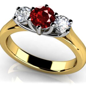 A truly innovative design, this gemstone and diamond ring features a six prong setting for the round center gemstone and a four prong setting for the accompanying round side diamonds. The brilliant gemstones truly stand out against the gold or platinum setting. Choose from two sizes including a 1 carat and 1.25 carat. This gemstone and diamond ring radiates so much sparkle and style!