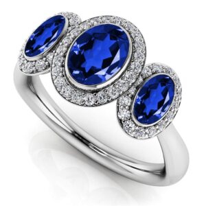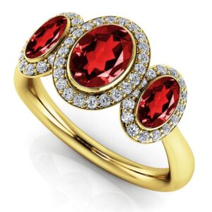 This beautiful anniversary ring features three oval shaped gemstones with diamond halos surrounding each gem. The center gemstone is larger than the two side gemstones. This vintage style ring has an elegant bezel setting and can be crafted in your choice of gold or platinum. Choose from the various diamond qualities, carat sizes, and natural gemstones to create the ring of her dreams!