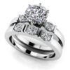 This is a fabulous engagement ring, featuring a brilliant diamond center stone, and a lovely baguette diamond on each side. What could be better. Well, adding a lovely, matching wedding band with 3 more incredible baguettes might be a good start! Both pieces sit comfortably together, and are available in gold or platinum. A really lovely combination with style staying power!