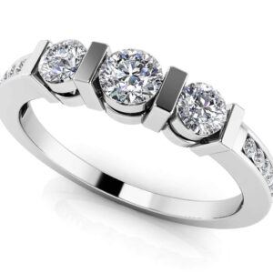 Three lovely diamonds are separated by artistic spacers in gold or platinum. Then, more diamonds, sitting perfectly in the channel on either side . talk about a brilliant design! Total diamond weight on this piece is nearly half a carat, and this would be a fabulous ring for your wedding band, but also lovely as an anniversary ring. It’s available in gold or platinum . a real winner!