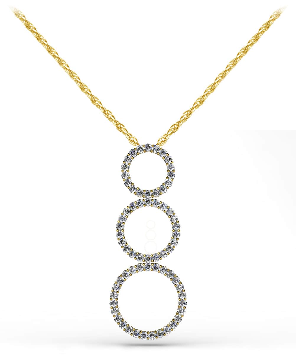 Simple yet sophisticated style. That’s what this pendant is all about. Featuring graduated circles, surrounded with diamonds, and crafted in your choice of gold or platinum, this one’s sure to please! It features one carat total diamond weight. Pick up this one today!