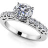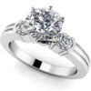This is a very elegant and understated design, and while it has simplicity about it, it has an abundance of style built right in! Featuring a lovely, round, prong-set diamond on either side of the center stone, you can have this beauty crafted in either white or yellow gold, or our favorite . platinum! You can also choose the size of the center stone our craftsmen will place into this ring for you…with your options being half a carat, ¾ of a carat, one carat, or a stunning 1.5 carats total diamond weight. Clean lines, classic design and our special touches make this a real winner!