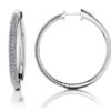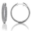 These remarkable diamond hoop earrings have a unique inside out design. The front of each hoop is lined with three rows of pave set diamonds. The inside is also lined with three rows of sparkling diamonds so when from the front and side you can see radiant diamond sparkle. There are 4 sizes to choose from including 1.99, 2.36, 3.00 and an amazing 3.65 carats of total diamond weight. Measuring at one inch in height and width, these medium sized hoops will add the perfect amount of sparkle to your look! Customize a pair for yourself or someone special in yellow gold, white gold or platinum today! These hoop earrings for women are also offered in a smaller and larger size.