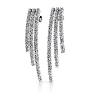 Long, Longer, Longest! That’s how we describe the strands of gleaming diamonds in these beautiful earrings. Each earring features 3 strands of round, prong-set diamonds that cascade perfectly down from the ear. Featuring a total diamond weight of 2 carats, these can be crafted in gold or platinum, the perfect finishing touch for that little black dress!