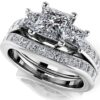 Express your love and say .I do. with this remarkable three stone diamond ring. This design features three exquisite emerald cut diamonds surrounded by sparkling princess cut diamonds that are set into the band. The matching bridal band is the perfect touch to complete this bold look. Choose yours today: available in 3 carat weights in your choice of gold or platinum setting.