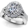 This beautiful anniversary ring features an oval gemstone that is surrounded by a diamond halo and 3 row wavy shank. This anniversary ring also features milgrain detail around the flower halo. Customize your anniversary ring by selecting the metal type, diamond clarity, gemstone and size.