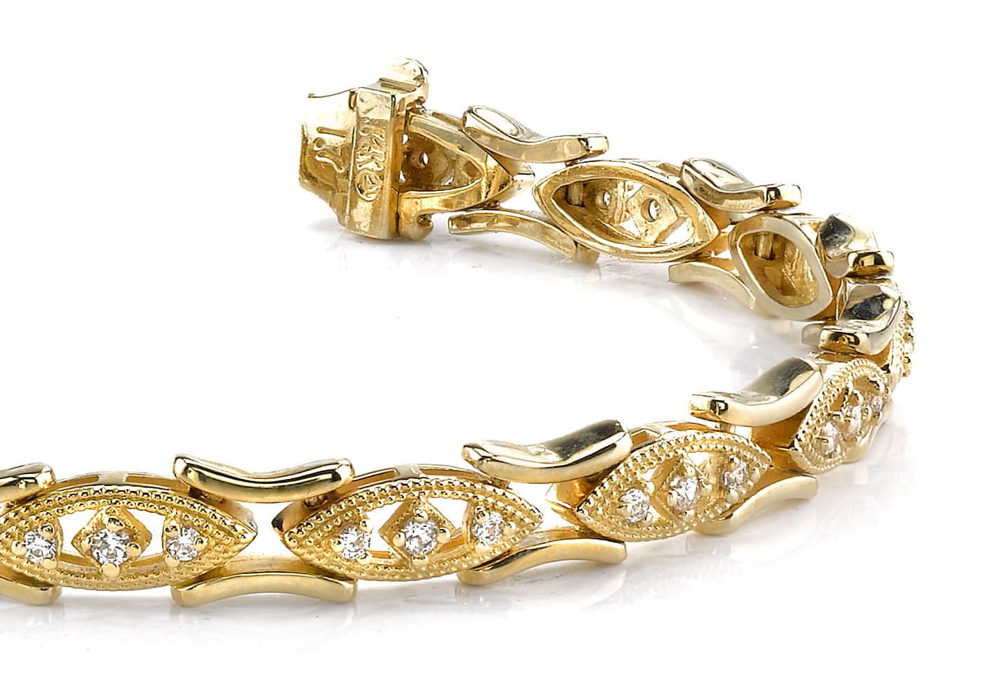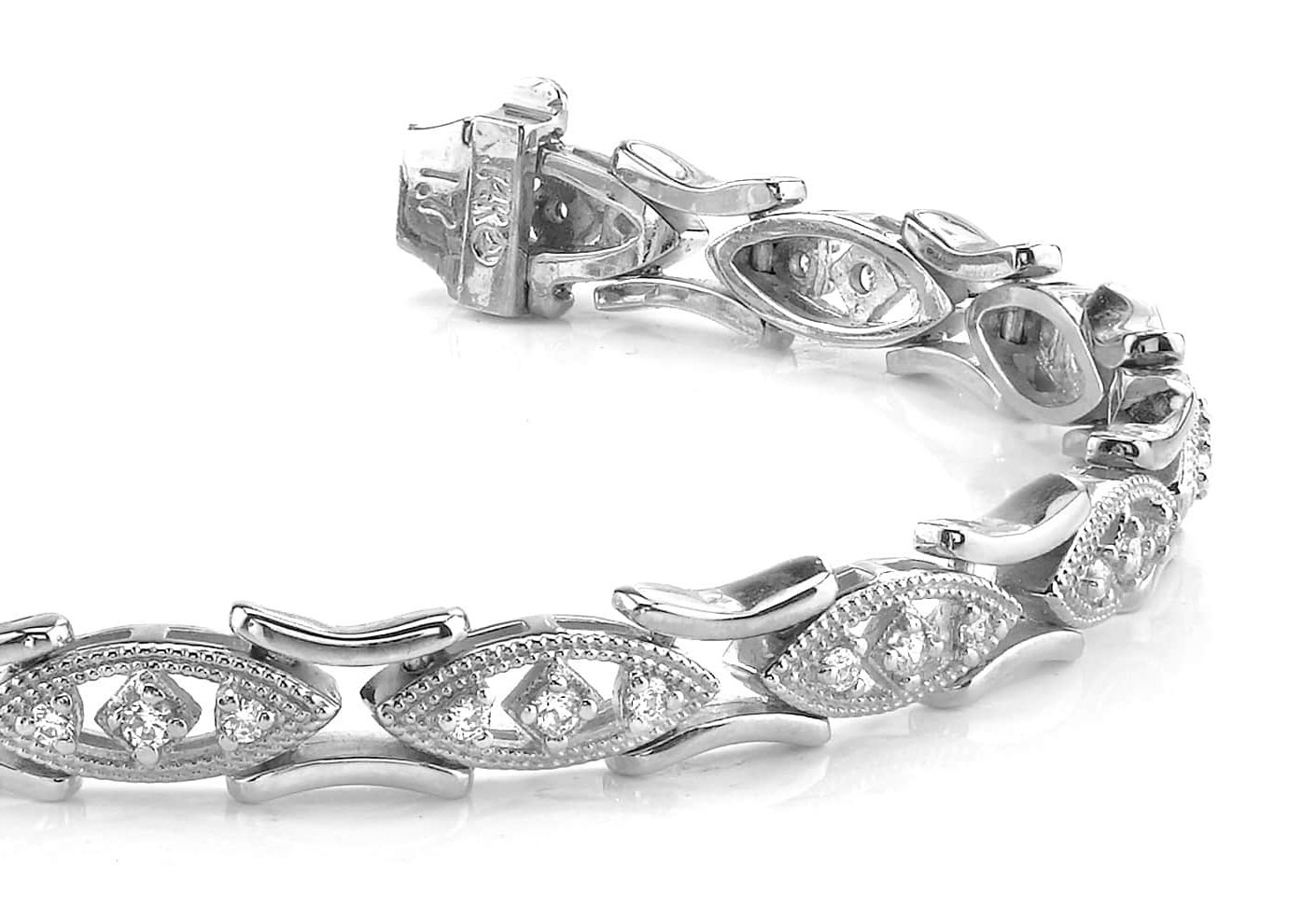 If you love the look of a marquis diamond, this bracelet gives it a very vintage twist! The marquis shaped links are crafted in either gold or platinum, and the detailed, filigree work on each is truly a masterpiece. Each one appears to float between hourglass shaped links . the effect is the perfect blend of vintage & modern!