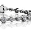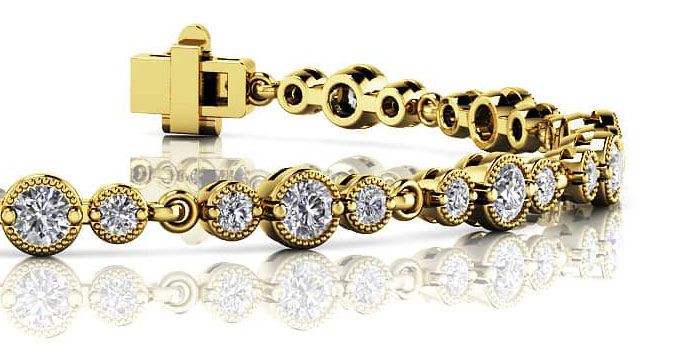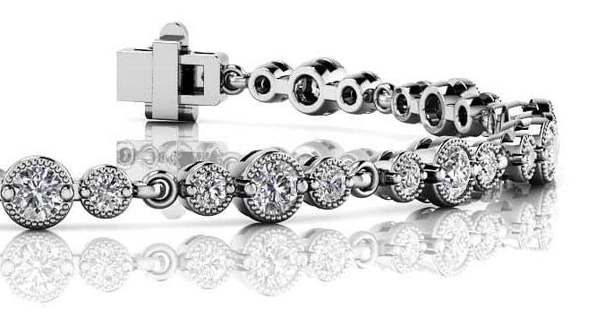 The vintage inspired look of this bracelet will dazzle you. Three diamonds, a center diamond and two sparking side diamonds, linked together create this unique bracelet. The milgrain edge detail adds to the vintage design.